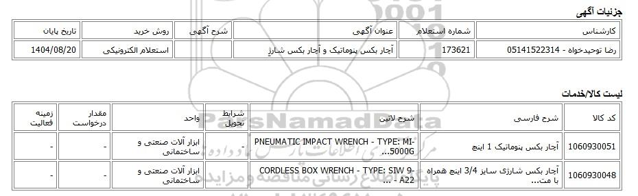 رضا توحیدخواه - 05141522314173621آچار بکس پنوماتیک و آچار بکس شارژِاستعلام الکترونیکی1404/08/20
