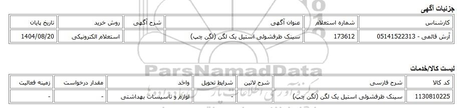 | آرش قائمی - 05141522313 | 173612 | سینک ظرفشوئی استیل یک لگن (لگن چپ) | استعلام الکترونیکی | 1404/08/20 |