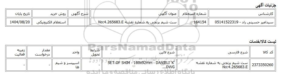 | سیدامیر حسینی راد - 05141522319 | 164154 | ست شیم برنجی به شماره نقشه No:4.265683.E | استعلام الکترونیکی | 1404/08/20 |