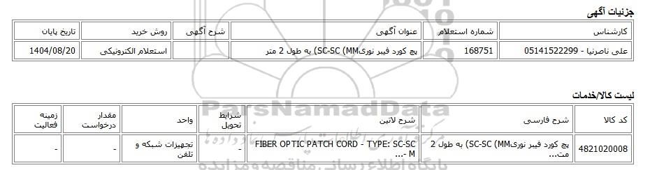 علی ناصرنیا - 05141522299168751پچ کورد فیبر نوریSC-SC (MM) به طول 2 متراستعلام الکترونیکی1404/08/20