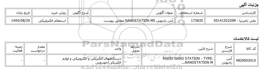 علی ناصرنیا - 05141522299173635آنتن رادیویی NANOSTATION M5 مطابق پیوستاستعلام الکترونیکی1404/08/20