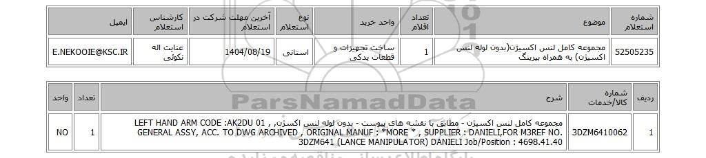 | 52505235 | مجموعه کامل لنس اکسیژن(بدون لوله لنس اکسیژن) به همراه بیرینگ | 1 | ساخت تجهیزات و قطعات یدکی | استانی | 1404/08/19 | عنایت اله نکوئی | E.NEKOOIE@KSC.IR |