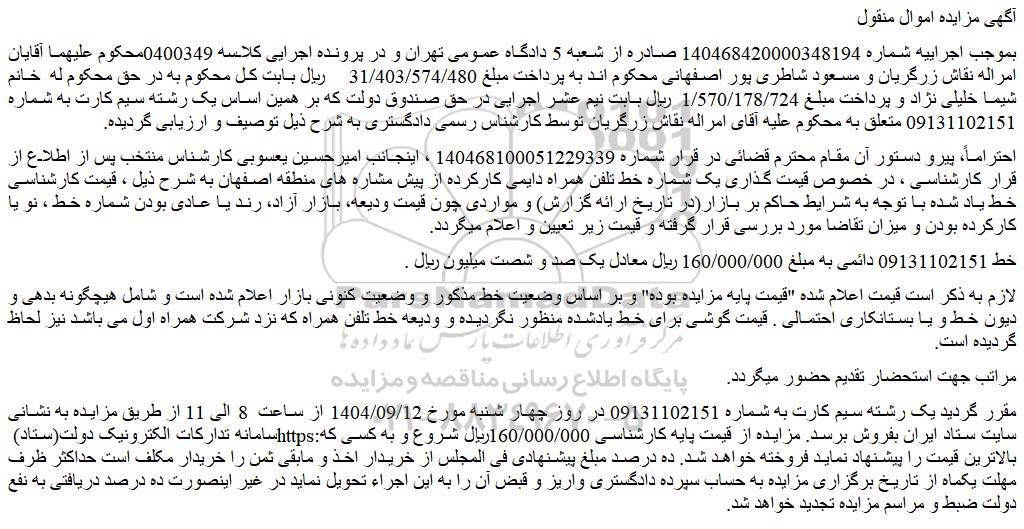 بموجب اجراییه شماره 140468420000348194 صادره از شعبه 5 دادگاه عمومی تهران و در پرونده اجرایی کلاسه 0400349محکوم علیهما آقایان امراله نقاش زرگریان و مسعود شاطری پور اصفهانی محکوم اند به پرداخت مبلغ 31/403/574/480 ریال بابت کل محکوم به در حق محکوم له خانم شیما خلیلی نژاد و پرداخت مبلغ 1/570/178/724 ریال بابت نیم عشر اجرایی در حق صندوق دولت که بر همین اساس یک رشته سیم کارت به شماره 09131102151 متعلق به محکوم علیه آقای امراله نقاش زرگریان توسط کارشناس رسمی دادگستری به شرح ذیل توصیف و ارزیابی گردیده.