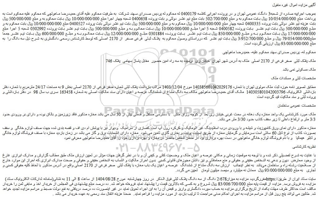 بموجب اجراییه صادره از شعبه3 دادگاه عمومی تهران و در پرونده اجرایی کلاسه 0400179 له محکوم له پردیس صدرای سهند شرکت به طرفیت محکوم علیه آقای حمیدرضا ماهوتچی که محکوم علیه محکوم است به پرداخت مبلغ 10/054/000/000 ریال بابت محکوم به و مبلغ 502/700/000 بابت مبلغ نیم عشر دولتی و بابت پرونده 0400638 شعبه چهار اجرا مبلغ 10/000/000/000 ریال بابت محکوم به و مبلغ 500/000/000 ریال بابت هزینه نیم عشر دولتی بابت پرونده 0400335 شعبه چهار مبلغ 10/000/000/000 ریال محکوم به و مبلغ 500/000/000 ریال بابت نیم عشر دولتی بابت پرونده 0400527 مبلغ 10/000/000/000 ریال بابت محکوم به و مبلغ 500/000/000 ریال بابت نیم عشر بابت پرونده 0400582 شعبه 5 اجرا مبلغ 10/000/000/000 ریال بابت محکوم به و مبلغ 500/000/000 ریال بابت نیم عشر بابت پرونده 0302992 شعبه 5 اجرا مبلغ 17/000/000/000 ریال بابت محکوم به و مبلغ 850/000/000 ریال بابت نیم عشر بابت پرونده 0301884 مبلغ 12/000/000/000 ریال بابت محکوم به و مبلغ 600/000/000 ریال بابت نیم عشر جمعا مبلغ79/054/000/000 ریال و مبلغ 3/952/700/000 ریال بابت نیم عشر که درراستای وصول محکوم به پلاک ثبتی فرعی صفر از 2170 اصلی که توسط کارشناس رسمی دادگستری به شرح ذیل سه دانگ را به مبلغ 93/000/000/000 ریال ارزیابی گردیده است.