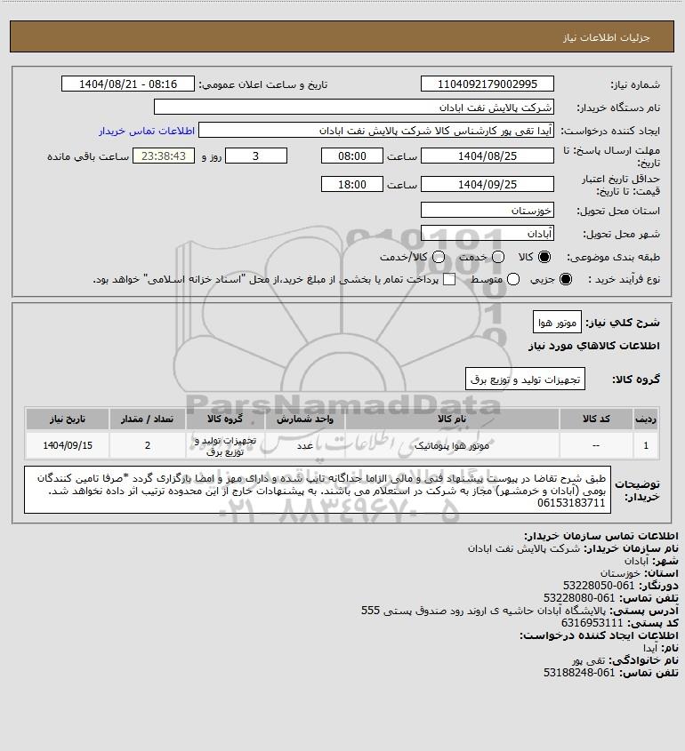 | 1 | -- | موتور هوا پنوماتیک | عدد | تجهیزات تولید و توزیع برق | 2 | 1404/09/15 |