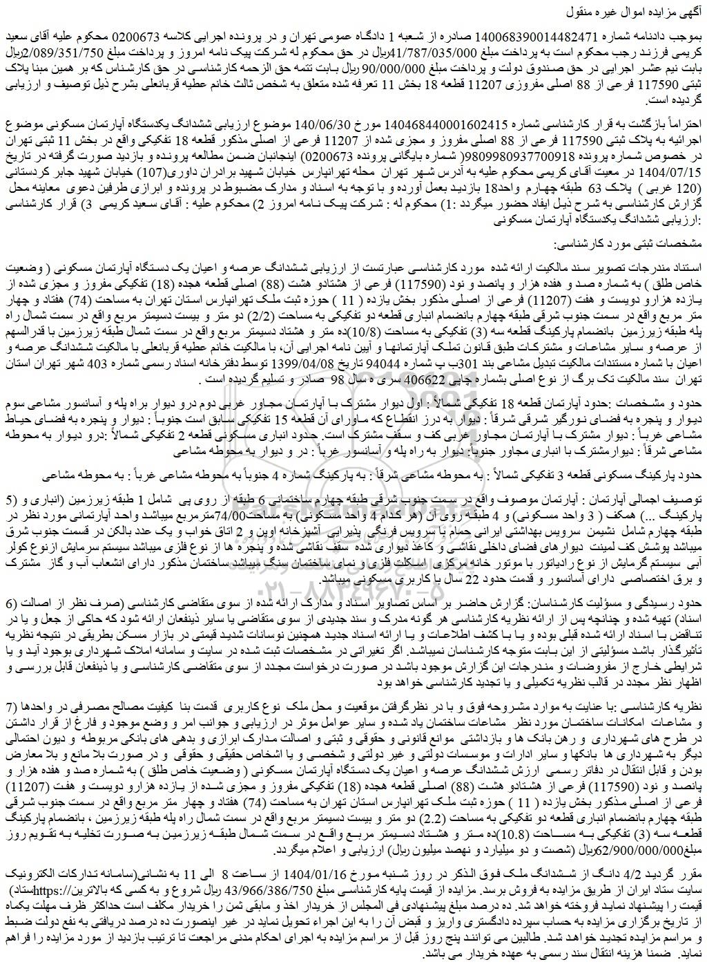 بموجب دادنامه شماره 140068390014482471 صادره از شعبه 1 دادگاه عمومی تهران و در پرونده اجرایی کلاسه 0200673 محکوم علیه آقای سعید کریمی فرزند رجب محکوم است به پرداخت مبلغ 41/787/035/000ریال در حق محکوم له شرکت پیک نامه امروز و پرداخت مبلغ 2/089/351/750ریال بابت نیم عشر اجرایی در حق صندوق دولت و پرداخت مبلغ 90/000/000 ریال بابت تتمه حق الزحمه کارشناسی در حق کارشناس که بر همین مبنا پلاک ثبتی 117590 فرعی از 88 اصلی مفروزی 11207 قطعه 18 بخش 11 تعرفه شده متعلق به شخص ثالث خانم عطیه قربانعلی بشرح ذیل توصیف و ارزیابی گردیده است.
