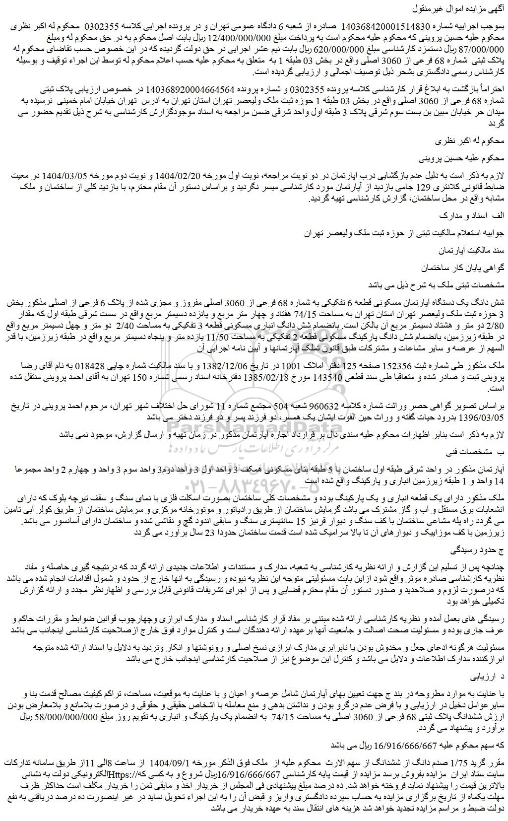 بموجب اجراییه شماره 140368420001514830  صادره از شعبه 6 دادگاه عمومی تهران و در پرونده اجرایی کلاسه 0302355  محکوم له اکبر نظری محکوم علیه حسین پروینی که محکوم علیه محکوم است به پرداخت مبلغ 12/400/000/000 ریال بابت اصل محکوم به در حق محکوم له ومبلغ 87/000/000 ریال دستمزد کارشناسی مبلغ 620/000/000 ریال بابت نیم عشر اجرایی در حق دولت گردیده که در این خصوص حسب تقاضای محکوم له  پلاک ثبتی  شماره 68 فرعی از 3060 اصلی واقع در بخش 03 طبقه 1 به  متعلق به محکوم علیه حسب اعلام محکوم له توسط این اجراء توقیف و بوسیله کارشناس رسمی دادگستری بشحر ذیل توصیف اجمالی و ارزیابی گردیده است.