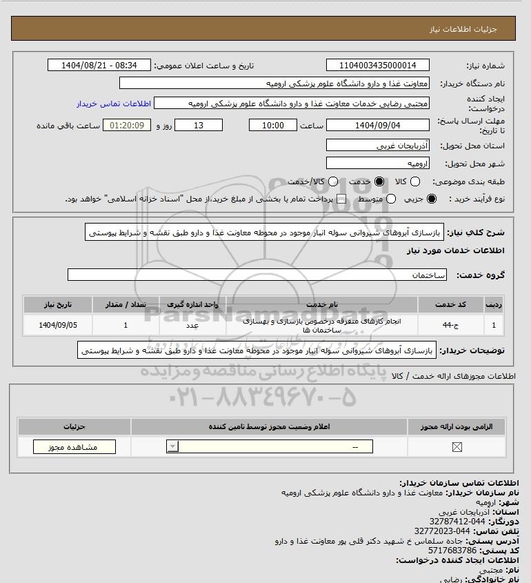 شرح کلی نیاز: بازسازی آبروهای شیروانی سوله انبار موجود در محوطه معاونت غذا و دارو طبق نقشه و شرایط پیوستی