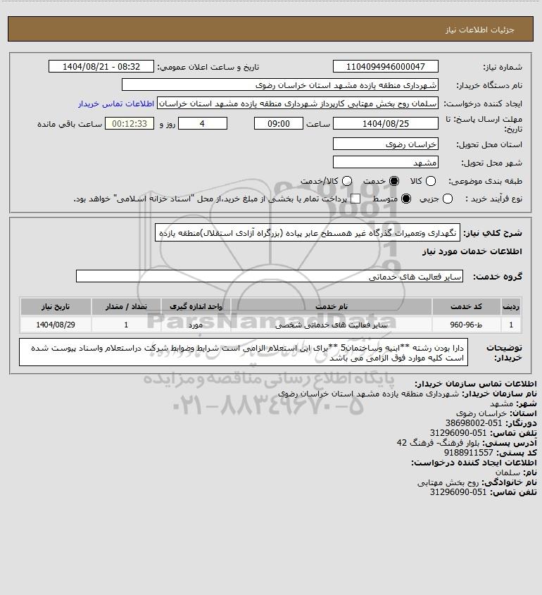 شرح کلی نیاز: نگهداری وتعمیرات گذرگاه غیر همسطح عابر پیاده (بزرگراه آزادی استقلال)منطقه یازده