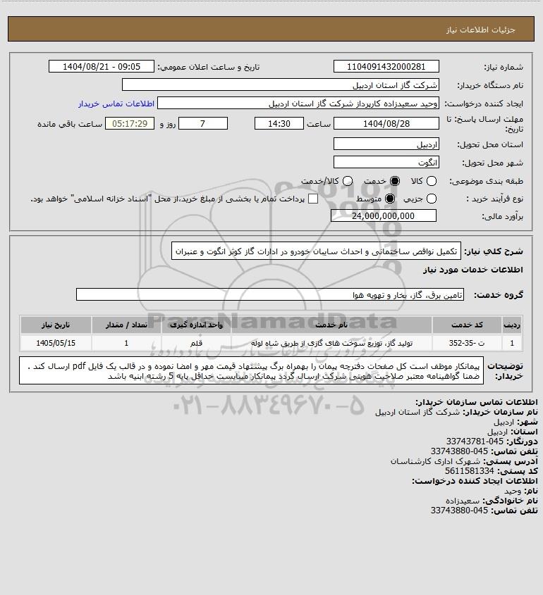 شرح کلی نیاز: تکمیل نواقص ساختمانی و احداث سایبان خودرو در ادارات گاز کوثر انگوت و عنبران
