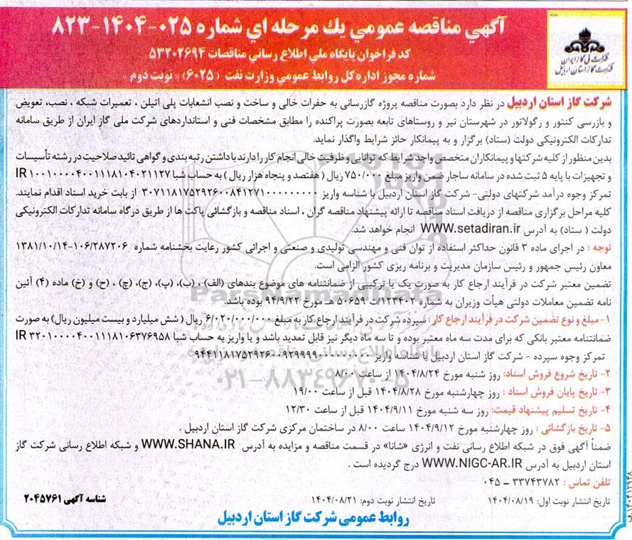 شرکت گاز استان اردبیل در نظر دارد بصورت مناقصه پروژه گازرسانی به حفرات خالی و ساخت و نصب انشعابات پلی اتیلن ، تعمیرات شبکه ، نصب، تعویض و بازرسی کنتور و رگولاتور در شهرستان نیر و روستاهای تابعه بصورت پراکنده را مطابق مشخصات فنی و استانداردهای شرکت ملی گاز ایران از طریق سامانه تدارکات الکترونیکی دولت (ستاد) برگزار و به پیمانکار حائز شرایط واگذار نماید.