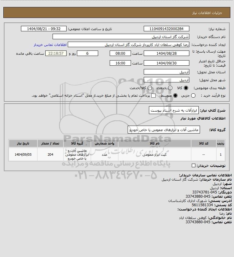 شرح کلی نیاز: ابزارآلات به شرح اسناد پیوست