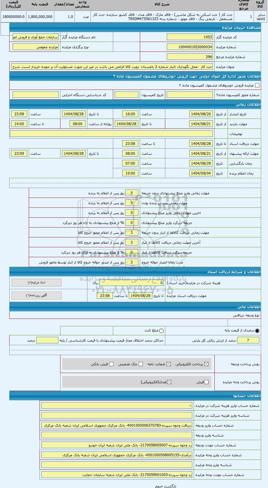 مزایده ، جت کار  -محل نگهداری :انبار شماره 2 باغستان -رویت کالا الزامی می باشد در غیر این صورت مسئولیت آن بر عهده خریدار است
