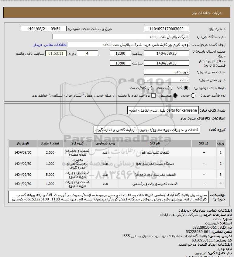 شرح کلی نیاز: parts for kerosene طبق شرح تقاضا و نمونه