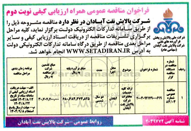 | مناقصه عمومی شماره 83/04 | 2004092179000619 | ارائه کلیه خدمات مخابرات شرکت پالایش نفت آبادان | آبادان | دو سال شمسی | 680.384.374.825 | 30.707.700.000 | الف- مهلت دریافت اسناد ارزیابی کیفی از سامانه ستاد از 1404.8.12 لغایت 1404.8.22 ب- مهلت ارسال پاسخ استعلام : 1404.9.8 |