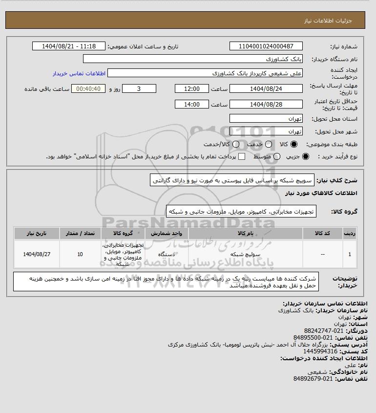 | 1 | -- | سوئیچ شبکه | دستگاه | تجهیزات مخابراتی، کامپیوتر، موبایل، ملزومات جانبی و شبکه | 10 | 1404/08/27 |