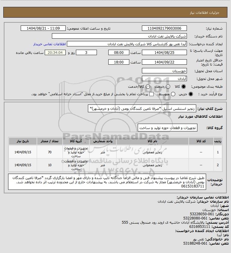 استعلام زنجیر استنلس استیل *صرفا تامین کنندگان بومی (آبادان و خرمشهر)*, استعلام زنجیر استنلس استیل *صرفا تامین کنندگان بومی (آبادان و خرمشهر)*