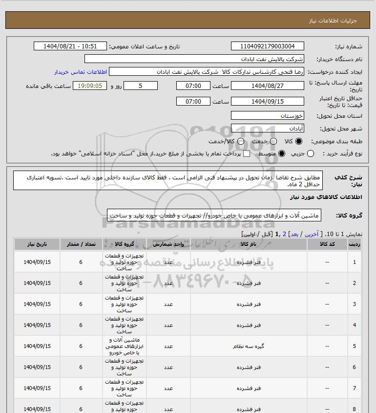 شرح کلی نیاز: مطابق شرح تقاضا .زمان تحویل در پیشنهاد فنی الزامی است . فقط کالای سازنده داخلی مورد تایید است .تسویه اعتباری حداقل 2 ماه.