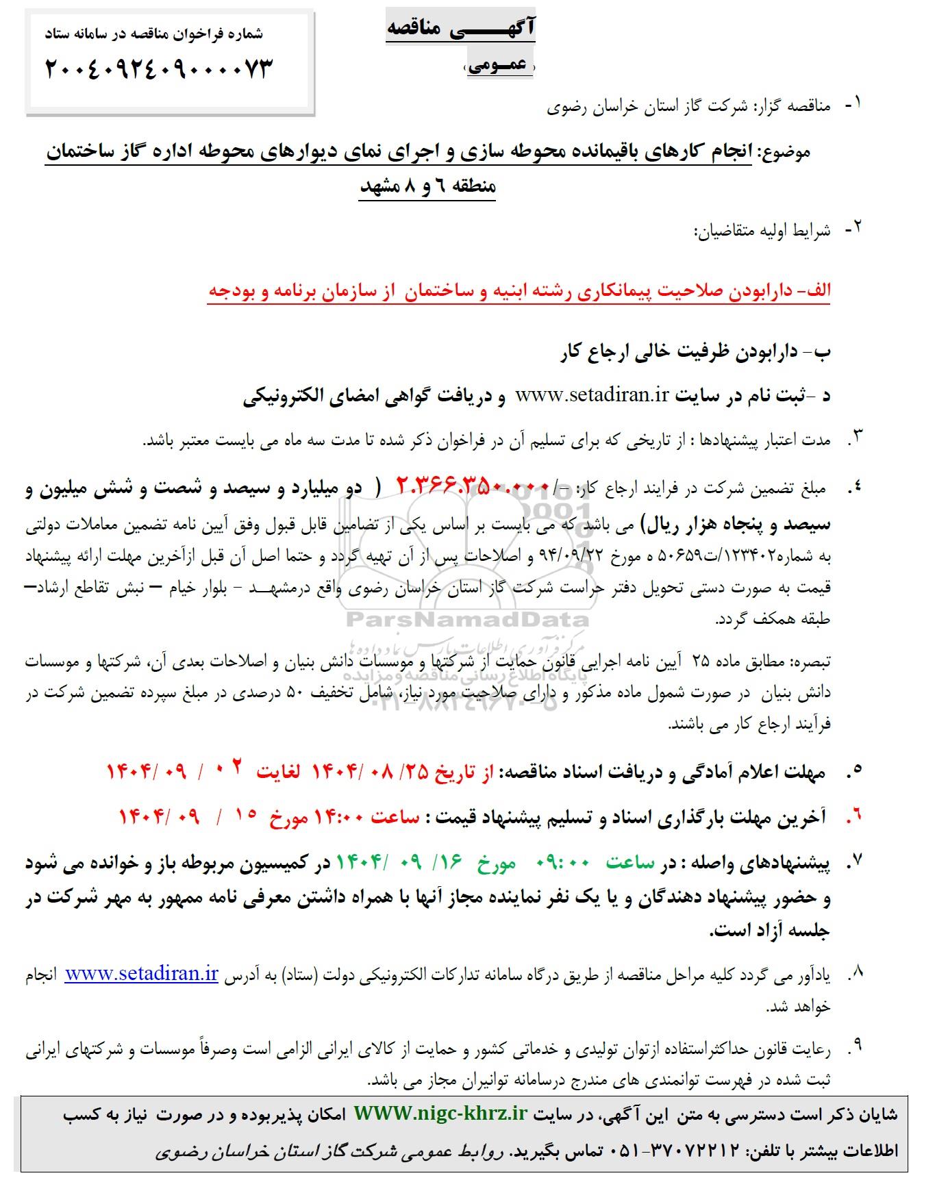شایان ذکر است دسترسی به متن این آگهی در سایت WWW.nigc-khiz.ir امکان پذیر بوده و در صورت نیاز به کسب اطلاعات بیشتر با تلفن 37072212 - 051 تماس بگیرید روابط عمومی شرکت گاز استان خراسان رضوی