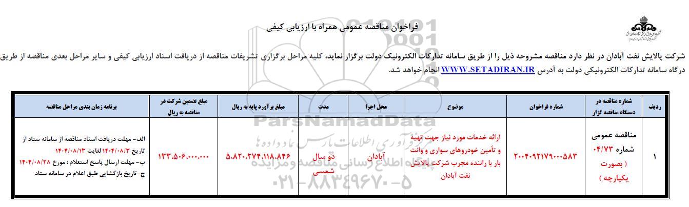 | 1 | مناقصه عمومی شماره 04/73 (بصورت یکپارچه) | 2004092179000583 | ارائه خدمات مورد نیاز جهت تهیه و تامین خودروهای سواری و وانت بار با راننده مجرب شرکت پالایش نفت آبادان | آبادان | دو سال شمسی | 5.820.274.118.846 | 133.506.000.000 | الف- مهلت دریافت اسناد مناقصه از سامانه ستاد از تاریخ 1404.08.3 لغایت 1404.08.13 ب- مهلت ارسال پاسخ استعلام مورخ 1404.08.28 ج- تاریخ بازگشایی طبق اعلام در سامانه ستاد |