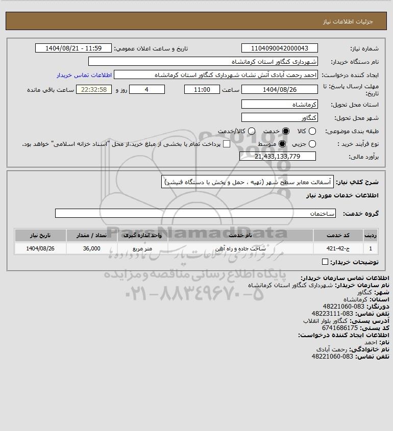 شرح کلی نیاز: آسفالت معابر سطح شهر (تهیه ، حمل و پخش با دستگاه فنیشر)