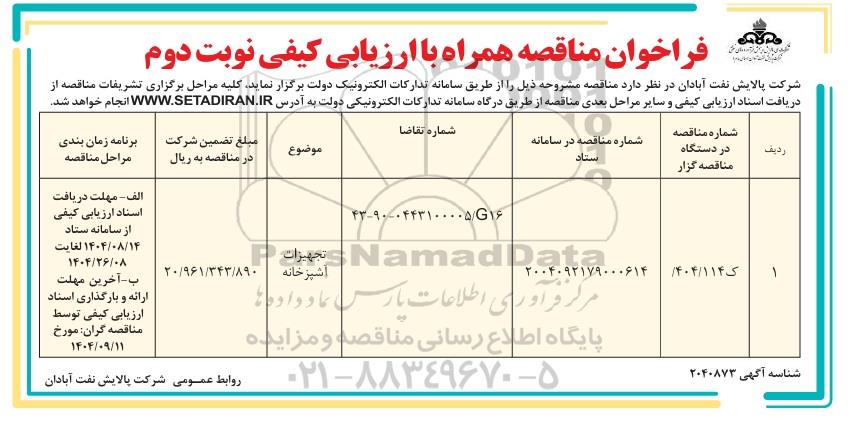 شرکت پالایش نفت آبادان در نظر دارد مناقصه مشروحه ذیل را از طریق سامانه تدارکات الکترونیک دولت برگزار نماید. کلیه مراحل برگزاری تشریفات مناقصه از دریافت اسناد ارزیابی کیفی و سایر مراحل بعدی مناقصه از طریق درگاه سامانه تدارکات الکترونیکی دولت به آدرس ستاد ایران انجام خواهد شد.