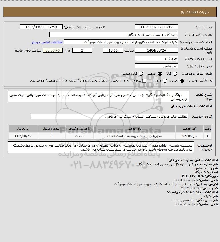 شرح کلی نیاز: بابت واگذاری فعالیت پیشگیری از تنبلی چشم و غربالگری بینایی کودکان شهرستان میناب به موسسات غیر دولتی دارای مجوز از بهزیستی