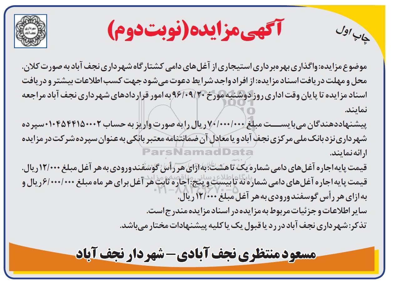 موضوع مزایده : واگذاری بهره برداری استیجاری از آغل های دامی کشتارگاه شهرداری نجف آباد به صورت کلان.