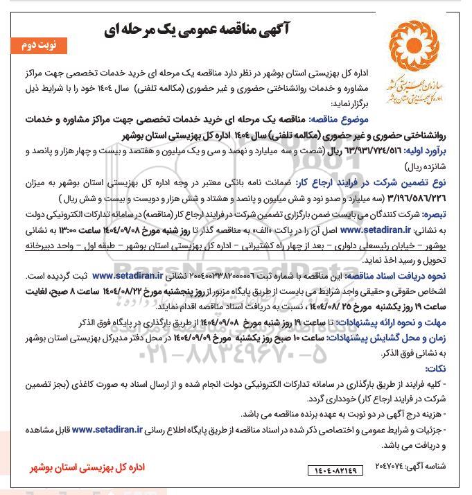 اداره کل بهزیستی استان بوشهر در نظر دارد مناقصه یک مرحله ای خرید خدمات تخصصی جهت مراکز مشاوره و خدمات روانشناختی حضوری و غیر حضوری (مکالمه تلفنی) سال 1404 خود را با شرایط ذیل برگزار نماید