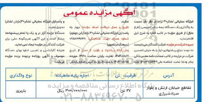 قرارگاه عملیاتی لشکر 30 نزاجا در نظر دارد نسبت به واگذاری یک دستگاه نیمه یدک کمپرسی (طرح مارال) از طریق مزایده در قالب اجاره به شرح ذیل اقدام نمایند