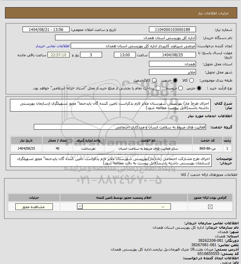 توضیحات خریدار:اجرای طرح مشارکت اجتماعی زنان(ماز)بهزیستی شهرستان ملایر لازم بذکراست تامین کننده گان بایدحتما" مجوز تسهیلگری ازسازمان بهزیستی داشته باشند(فایل پیوست به دقت مطالعه شود)