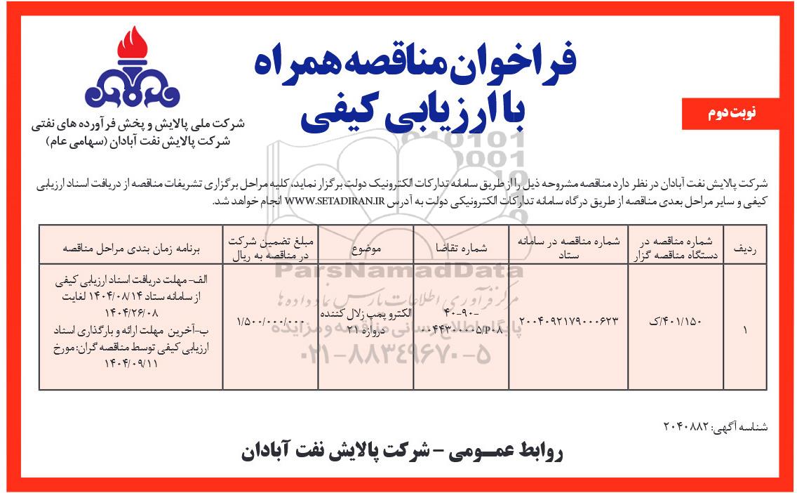 شرکت پالایش نفت آبادان در نظر دارد مناقصه مشروحه ذیل را از طریق سامانه تدارکات الکترونیک دولت برگزار نماید کلیه مراحل برگزاری تشریفات مناقصه از دریافت اسناد ارزیابی کیفی و سایر مراحل بعدی مناقصه از طریق درگاه سامانه تدارکات الکترونیکی دولت به آدرس ستاد ایران انجام خواهد شد.