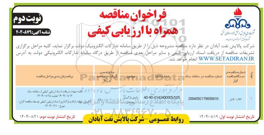 شرکت پالایش نفت آبادان در نظر دارد مناقصه مشروحه ذیل را از طریق سامانه تدارکات الکترونیک دولت برگزار نماید کلیه مراحل برگزاری تشریفات مناقصه از دریافت اسناد ارزیابی کیفی و سایر مراحل بعدی مناقصه از طریق درگاه سامانه تدارکات الکترونیکی دولت به آدرس ستاد ایران انجام خواهد شد.