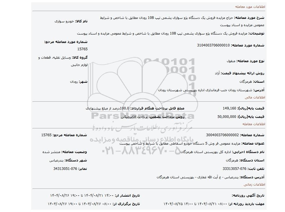 مزایده عمومی مزایده مزایده فروش یک دستگاه پژو سواری یشمی تیپ 108 رودان مطابق با شاخص و شرایط عمومی مزایده و اسناد پیوست برگزار میگردد. از کلیه افراد متخصص و شرکت‌های واجد شرایط دعوت به عمل می‌آید تا در این مزایده با کد خبرگزاری پارس نماد : 9842987 شرکت نمایند تاریخ شروع مزایده : 1404/08/21 مهلت شرکت در مزایده: تا پایان روز 1404/08/26 مکان برگزاری اموال واگذاری استان‌های مزایدات استان هرمزگان و دسته‌بندی‌های مربوط به این حراجی انواع خودرو سبک میباشد.