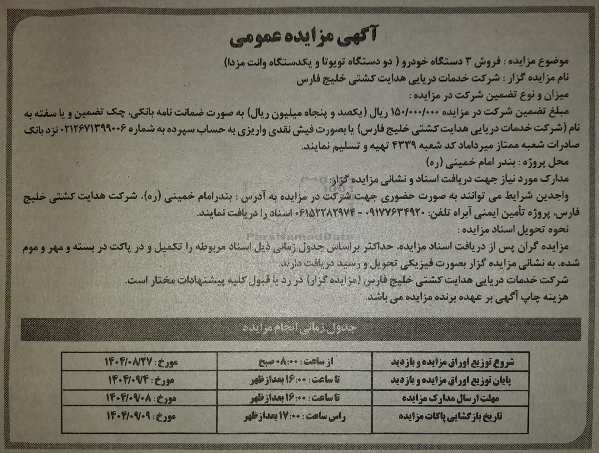 شرکت خدمات دریایی هدایت کشتی خلیج فارس مزایده گزار در رد یا قبول کلیه پیشنهادات مختار است.هزینه چاپ آگهی بر عهده برنده مزایده میباشد.