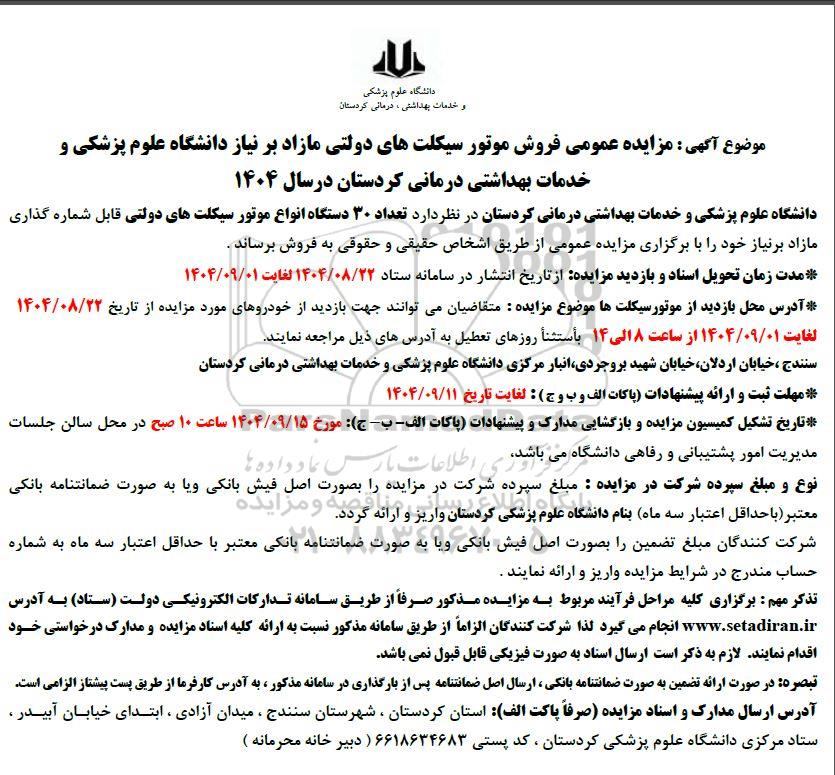 موضوع آگهی مزایده عمومی فروش موتور سیکلت های دولتی مازاد برنیاز دانشگاه علوم پزشکی و خدمات بهداشتی درمانی کردستان در سال 1404؟