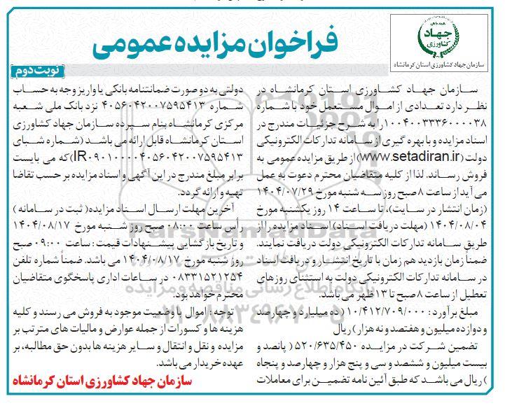 سازمان جهاد کشاورزی استان کرمانشاه در نظر دارد تعدادی از اموال مستعمل خود با شماره 1004003336000038 را به شرح جزئیات مندرج در اسناد مزایده و با بهره گیری از سامانه تدارکات الکترونیکی دولت (ستاد ایران) از طریق مزایده عمومی به فروش رساند. لذا از کلیه متقاضیان محترم دعوت به عمل می آید از ساعت 8 صبح روز سه شنبه مورخ 1404.07.29 (زمان انتشار در سایت) تا ساعت 14 روز یکشنبه مورخ 1404.08.04 (مهلت دریافت اسناد اسناد) مزایده را از طریق سامانه تدارکات الکترونیکی دولت دریافت نمایند. ضمنا زمان بازدید هم زمان با تاریخ انتشار و دریافت اسناد در سامانه تدارکات الکترونیکی دولت به استثنای روزهای تعطیل از ساعت 8 صبح تا 13 ظهر می باشد.