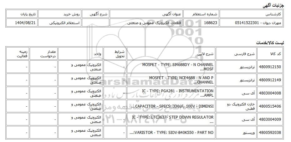 | مهران دیوان - 05141522301 | 168623 | قطعات الکترونیک عمومی و صنعتی | استعلام الکترونیکی | 1404/08/21 |