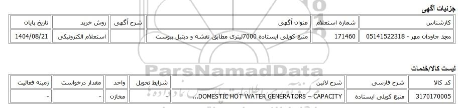 | محمد جاودان مهر - 05141522318 | 171460 | منبع کویلی ایستاده 7000لیتری مطابق نقشه و دیتیل پیوست | استعلام الکترونیکی | 1404/08/21 |