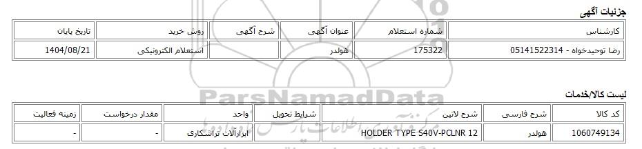 | 1060749134 | هولدر | HOLDER TYPE S40V-PCLNR 12 | ابزارآلات تراشکاری | - | - |