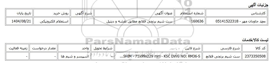 | محمد جاودان مهر - 05141522318 | 160636 | ست شیم برنجی فلانچ مطابق نقشه و دیتیل | استعلام الکترونیکی | 1404/08/21 |