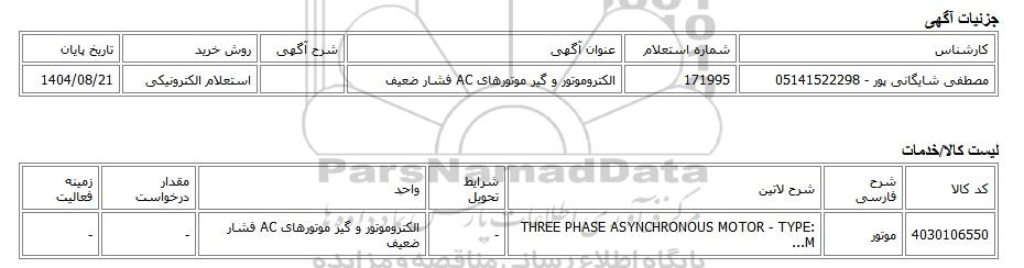 مصطفی شایگانی پور - 05141522298171995الکتروموتور و گیر موتورهای AC فشار ضعیفاستعلام الکترونیکی1404/08/21
