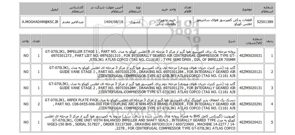 | 52501389 | قطعات یدکی کمپرسور هوای سانتریفوژ اطلس کوپکو | 5 | خرید تجهیزات وقطعات یدکی | کشوری | 1404/08/19 | عبدالامیر مقدم | A.MOGHADAM@KSC.IR |
