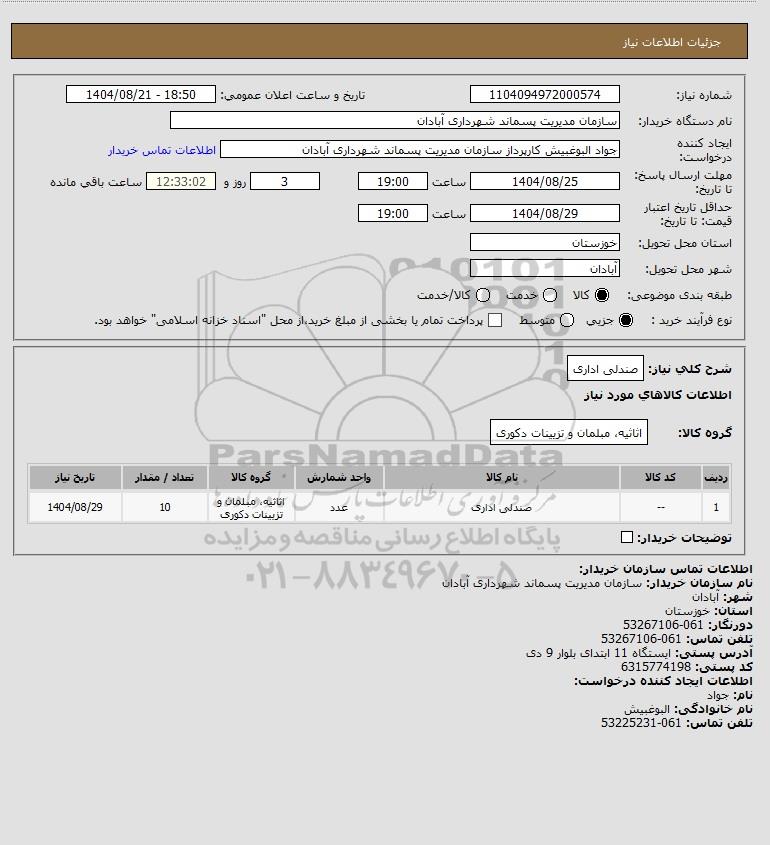 | 1 | -- | صندلی اداری | عدد | اثاثیه، مبلمان و تزیینات دکوری | 10 | 1404/08/29 |
