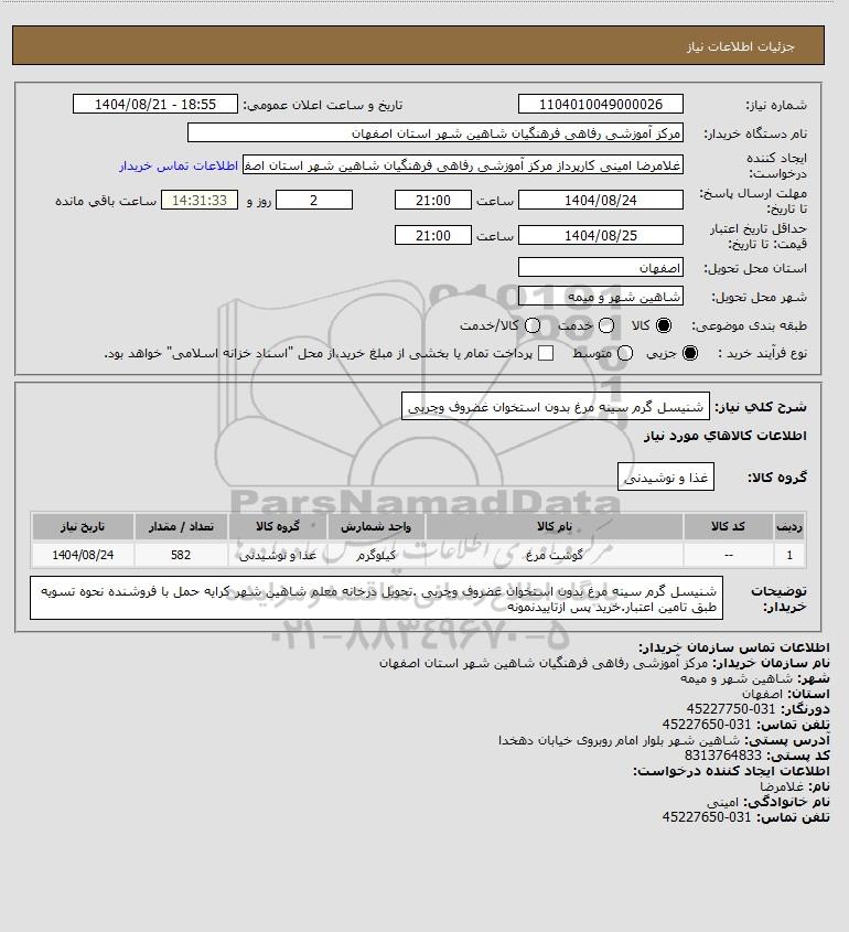 شرح کلی نیاز: شنیسل گرم سینه مرغ بدون استخوان غضروف وچربی