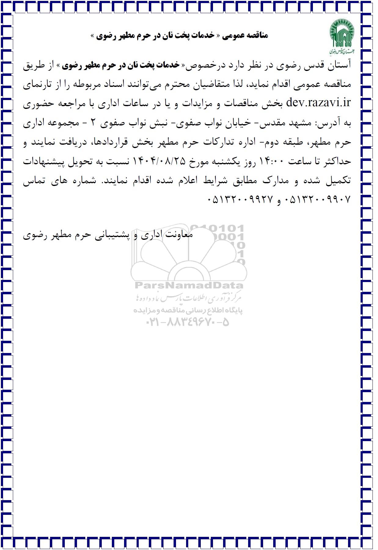 آستان قدس رضوی در نظر دارد در خصوص «خدمات پخت نان در حرم مطهر رضوی » از طریق مناقصه عمومی اقدام نماید، لذا متقاضیان محترم می توانند اسناد مربوطه را از تارنمای dev.razavi.ir بخش مناقصات و مزایدات و یا در ساعات اداری با مراجعه حضوری به آدرس: مشهد مقدس - خیابان نواب صفوی - نبش نواب صفوی 2 - مجموعه اداری حرم مطهر - طبقه دوم - اداره تدارکات حرم مطهر بخش قراردادها، دریافت نمایند و حداکثر تا ساعت 14:00 روز یکشنبه مورخ 1404.08.25 نسبت به تحویل پیشنهادات تکمیل شده و مدارک مطابق شرایط اعلام شده اقدام نمایند. شماره های تماس 05132009907 و 05132009927