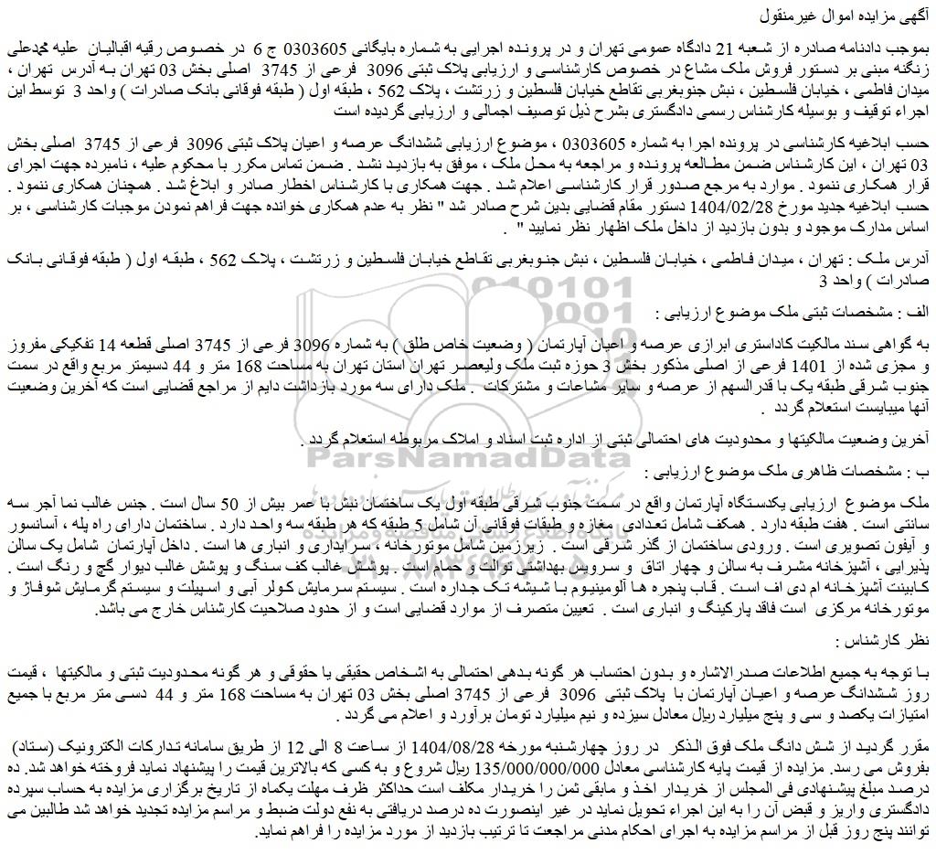 بموجب دادنامه صادره از شعبه 21 دادگاه عمومی تهران و در پرونده اجرایی به شماره بایگانی 0303605 ج 6  در خصوص رقیه اقبالیان  علیه محمدعلی زنگنه مبنی بر دستور فروش ملک مشاع در خصوص کارشناسی و ارزیابی پلاک ثبتی 3096  فرعی از 3745  اصلی بخش 03 تهران به آدرس  تهران ، میدان فاطمی ، خیابان فلسطین ، نبش جنوبغربی تقاطع خیابان فلسطین و زرتشت ، پلاک 562 ، طبقه اول ( طبقه فوقانی بانک صادرات ) واحد 3  توسط این اجراء توقیف و بوسیله کارشناس رسمی دادگستری بشرح ذیل توصیف اجمالی و ارزیابی گردیده است