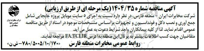 شرکت مخابرات ایران - منطقه فارس، در نظر دارد نسبت به اجرای 5 سایت موبایل پروژه جابجایی شامل جمع آوری و نصب دکل و فونداسیون و تجهیزات براساس مشخصات موجود در اسناد از طریق مناقصه عمومی اقدام نماید. لذا از کلیه پیمانکاران واجد شرایط دعوت به عمل می آید.