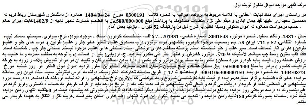 در راستای اجرای مفاد نیابت اعطایی به کلاسه مربوط به پرونده اجرائیه به شماره کلاسه 0300191 مورخ 1404/04/24 صادره از دادگستری شهرستان رباط کریم له محسین سفیداری علیها محمد جمال ابادی و میثم علی نژاد متضامنا محکومند به پرداخت مبلغ 580/000/000ریال به انضمام خسارت تاخیر تادیه از 1402/9لغایت اجرای حکم ، حسب درخواست محکوم له اموال منقولی وسیله نقلیه به شرح ذیل در پارکینگ 52 تهران ، بازدید بعمل آمد: