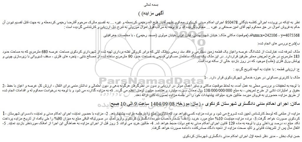 شعبه صادر کننده:شعبه اول اجرای احکام مدنی دادگستری شهرستان کردکوی